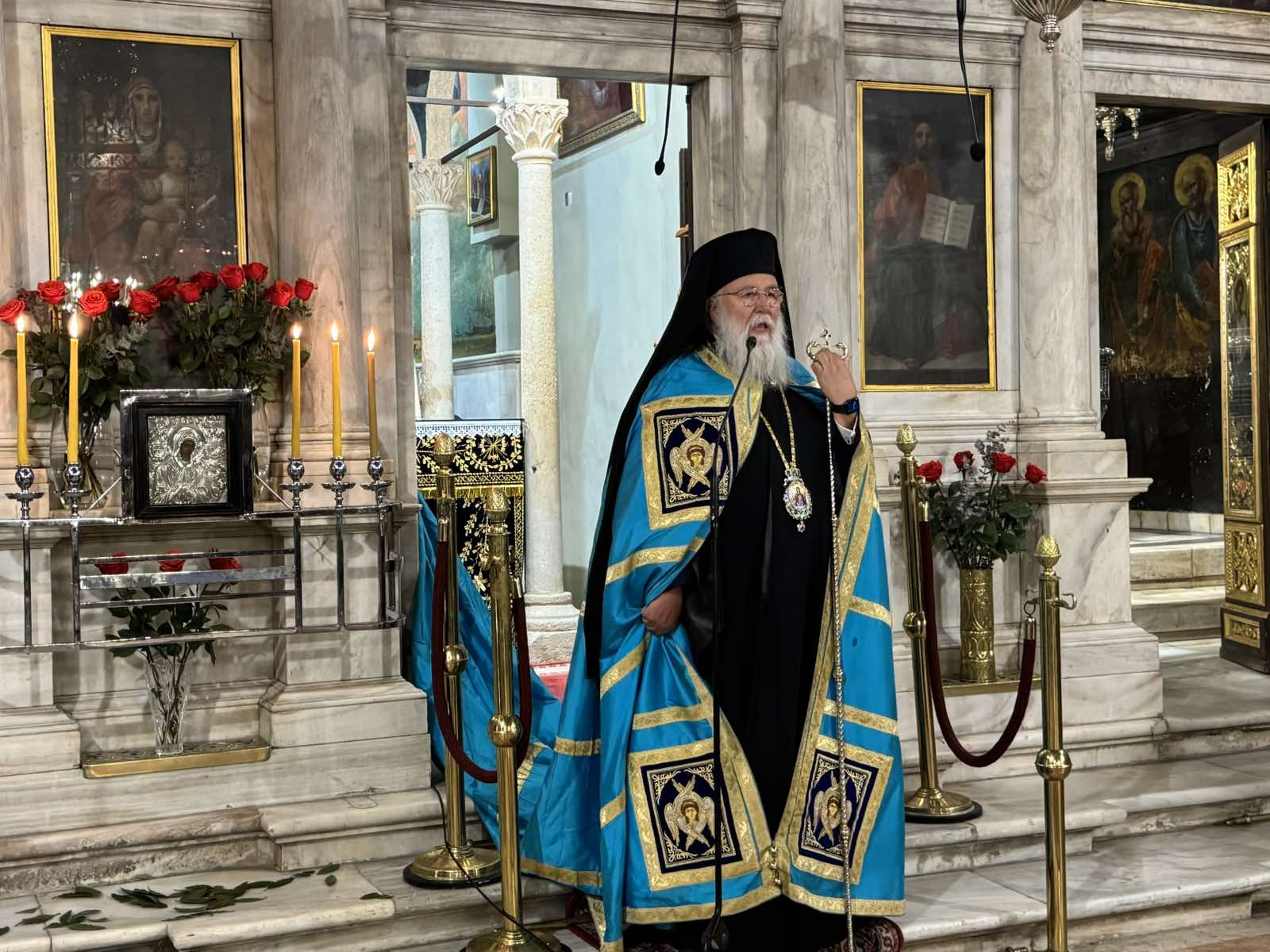 Ο Σεβασμιώτατος απευθυνόμενος στο πυκνό εκκλησίασμα, έλαβε αφορμή από το κουκούλιον του Ακαθίστου Ύμνου το οποίο αναφέρεται στον Δεσπότη Χριστόν, «Ξένον τόκον ἰδόντες, ξενωθῶμεν τοῦ κόσμου, τὸν νοὺν εἰς οὐρανὸν μεταθέντες». Ο Σεβασμιώτατος, αφού εξήγησε στους ανθρώπους σχετικά με το χρονικό της συγγραφής του Ακαθίστου Ύμνου, τόνισε ότι αυτό το ποίημα γράφτηκε σε μία δύσκολη στιγμή για την καμπή της ιστορίας της Κωνσταντινουπόλεως, η οποία χαρακτηρίζεται και ως πόλη της Παναγίας, της Θεοτόκου. Ο «Ξένος τόκος» στον οποίο αναφέρεται ο ιερός ποιητής, είναι ο τόκος της Παναγίας μας, είναι ο Κύριός μας Ιησούς Χριστός. Ο δε υμνογράφος, τον χαρακτηρίζει έτσι διότι δεν ομοιάζει ο Κύριός μας με κανέναν τόκον ο οποίος προήλθε εκ της συνευρέσεως ανδρός και γυναικός. Ο Κύριός μας είναι ο ένσαρκος Λόγος του Θεού και οικονομεί ο Θεός την σωτηρίαν του ανθρωπίνου γένους δι’ αυτού του τρόπου, καθώς ο Λόγος του Θεού είναι ο Δημιουργός του σύμπαντος κόσμου, επομένως και του ανθρώπου τον οποίο έπλασε κατ’ εικόνα και καθ’ ομοίωσίν Του. Μετά την πτώση του ανθρώπου και την απομάκρυνση του από τον Θεόν, ο οποίος ήταν κατά φύσιν ενωμένος με τον Θεό, είχε δηλαδή ο άνθρωπος συνέχεια θεϊκή, τώρα πλέον, με τη δική του θέληση και βούληση το υπερμέγιστον δώρο του Θεού στον άνθρωπο αποστασιοποιείται και η Εικόνα του Θεού παραμορφώνεται. Ως αποτέλεσμα, αμαυρώνεται και το καθ’ ομοίωσιν, δηλαδή η αγιότητα είναι ακατόρθωτη πλέον στη φθαρμένη εικόνα του Θεού. Έπρεπε λοιπόν, αυτός ο ίδιος ο Λόγος του Θεού να αναδημιουργήσει, να ανακαινίσει αυτόν τον άνθρωπο τον οποίο ο ίδιος δημιούργησε για να άρχει της δημιουργίας και της κτίσεως του Θεού.