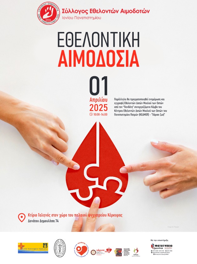 Ο Σύλλογος Εθελοντών Αιμοδοτών του Ιονίου Πανεπιστημίου, σε συνεργασία με το Τμήμα Αιμοδοσίας του Γενικού Νοσοκομείου Κέρκυρας και την Ιατροχειρουργική Εταιρεία Κέρκυρας, ανακοινώνει τη διοργάνωση εθελοντικής αιμοδοσίας με την υποστήριξη του Συλλόγου Εθελοντών Αιμοδοτών & Δοτών Μυελού των Οστών Κέρκυρας «Πανδότης» (μέλος της Πανελλήνιας Ομοσπονδίας Συλλόγων Εθελοντών Αιμοδοτών), την Τρίτη 1 Απριλίου στο κτίριο Γαληνός, που βρίσκεται στο παλαιό ψυχιατρείο (Δονάτου Δημουλίτσα 74), από τις 10:00 έως τις 14:00.