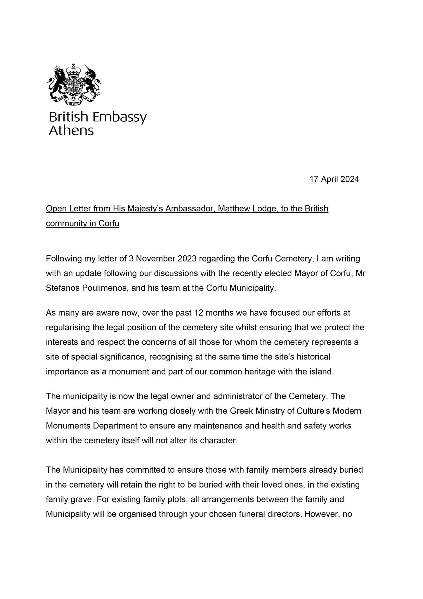 Το φθινόπωρο του 2023 με ανακοίνωση του Πρέσβυ της Μ. Βρετανίας, ενημερώθηκε η Βρετανική κοινότητα του νησιού για την τελεσίδικη και ολοκληρωτική μεταφορά της κυριότητας και δικαιοδοσίας επί του Βρετανικού Κοιμητηρίου στον Δήμο Κερκυραίων.