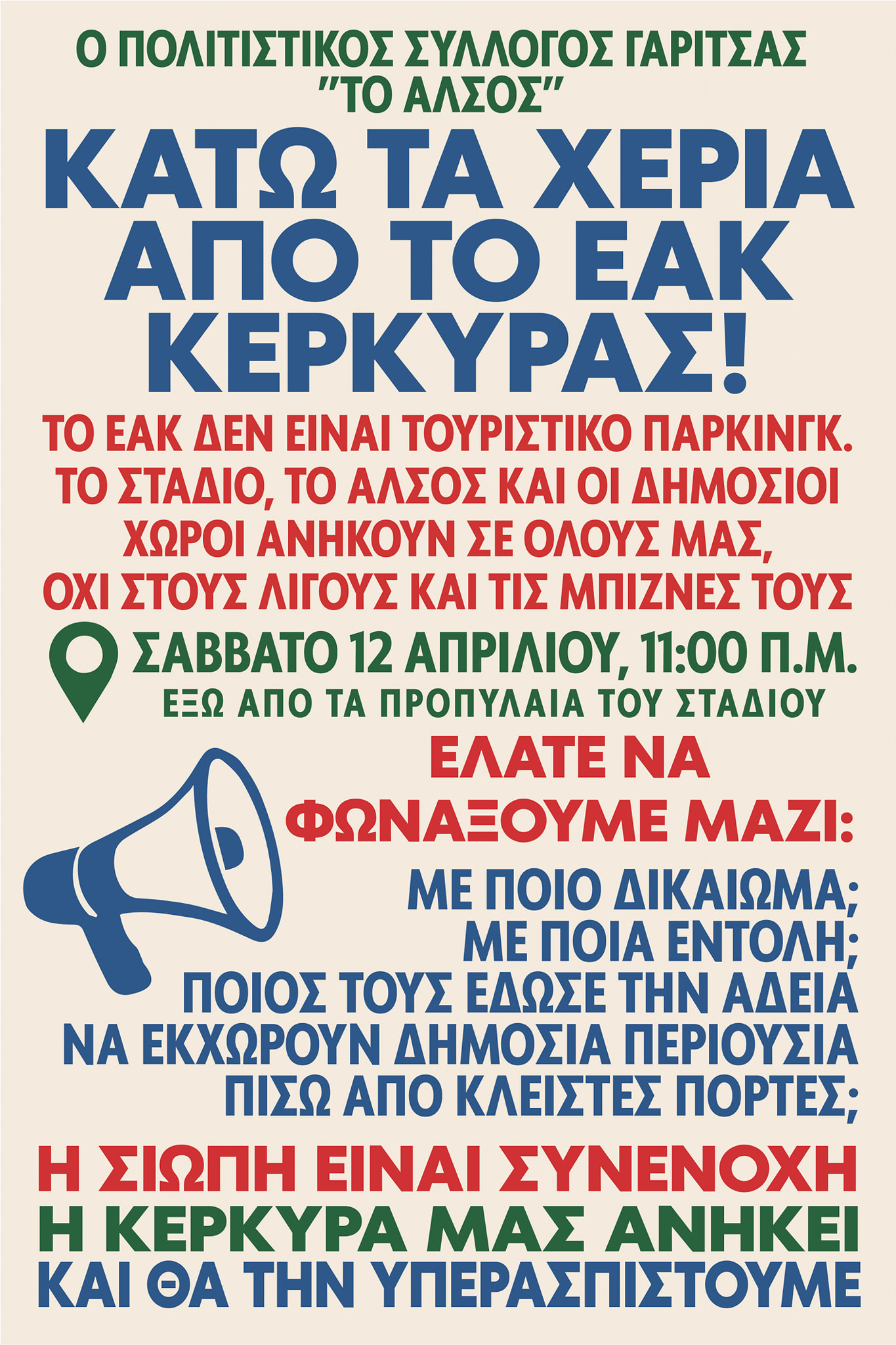 Σάββατο 12 Απριλίου, στις 11.00 π.μ., έξω από τα Προπύλαια του Σταδίου.
