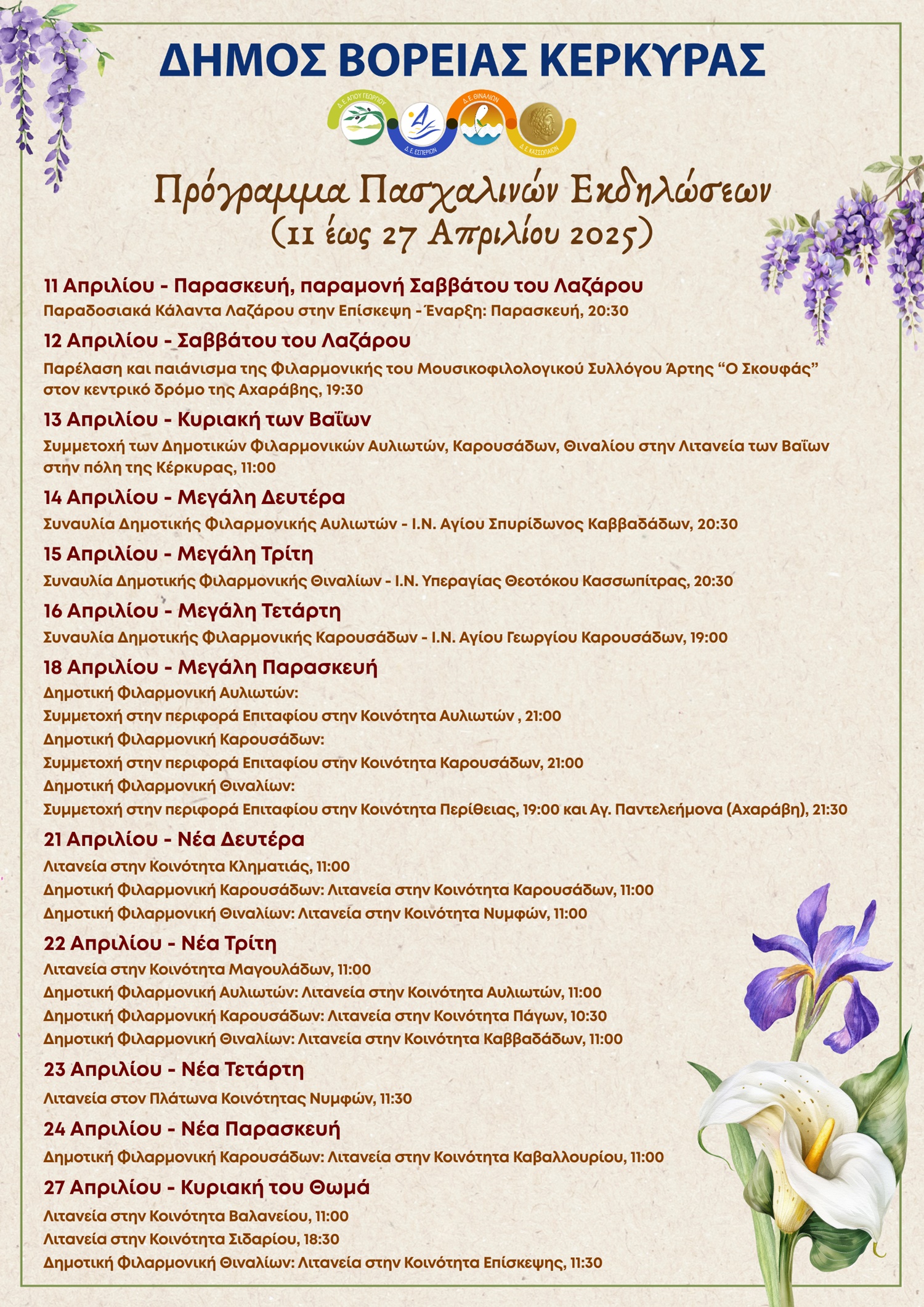 Ο Δήμος Βόρειας Κέρκυρας γνωστοποίησε το πρόγραμμα των εκδηλώσεων που θα πραγματοποιηθούν την περίοδο του Πάσχα.