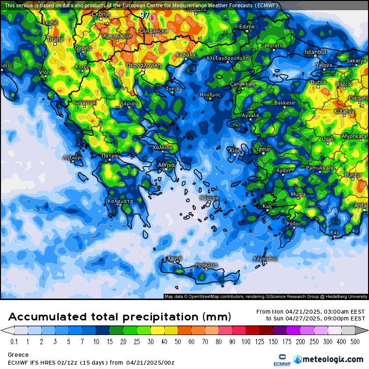 Ο χάρτης απεικονίζει τη σωρευτική βροχόπτωση για την Ελλάδα, σύμφωνα με το Ευρωπαϊκό μοντέλο ECMWF, μέχρι και τις 27 Απριλίου 2025.