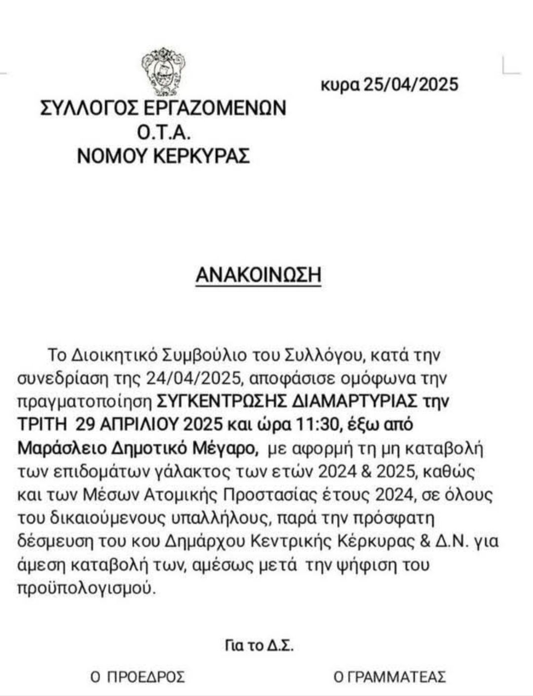 Εργαζόμενοι ΟΤΑ Κέρκυρας: Συγκέντρωση διαμαρτυρίας στο Μαράσλειο
