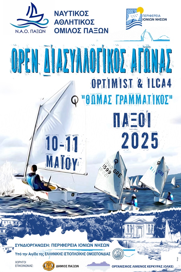 Ο Ναυτικός Αθλητικός Όμιλος Παξών (Ν.Α.Ο.Παξών) συνδιοργανώνει με την Περιφέρεια Ιονίων Νήσων τον Open Διασυλλογικός Αγώνας optimist & ILCA4 «Θωμάς Γραμματικός» που θα διεξαχθεί στους Παξούς στις 10-11 Μαΐου 2025.
