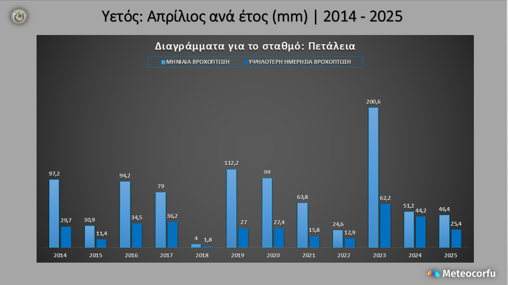 Στατιστικά στοιχεία του ορεινού ερασιτεχνικού μετεωρολογικού σταθμού Πετάλεια Κέρκυρας από το Εθνικό Αστεροσκοπείο Αθηνών για τον Απρίλιο 2025