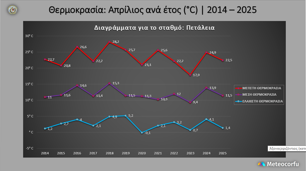 Από το 2014 έως το 2025, οι θερμοκρασίες του Απριλίου στον σταθμό Πετάλεια παρουσιάζουν σημαντικές διακυμάνσεις.