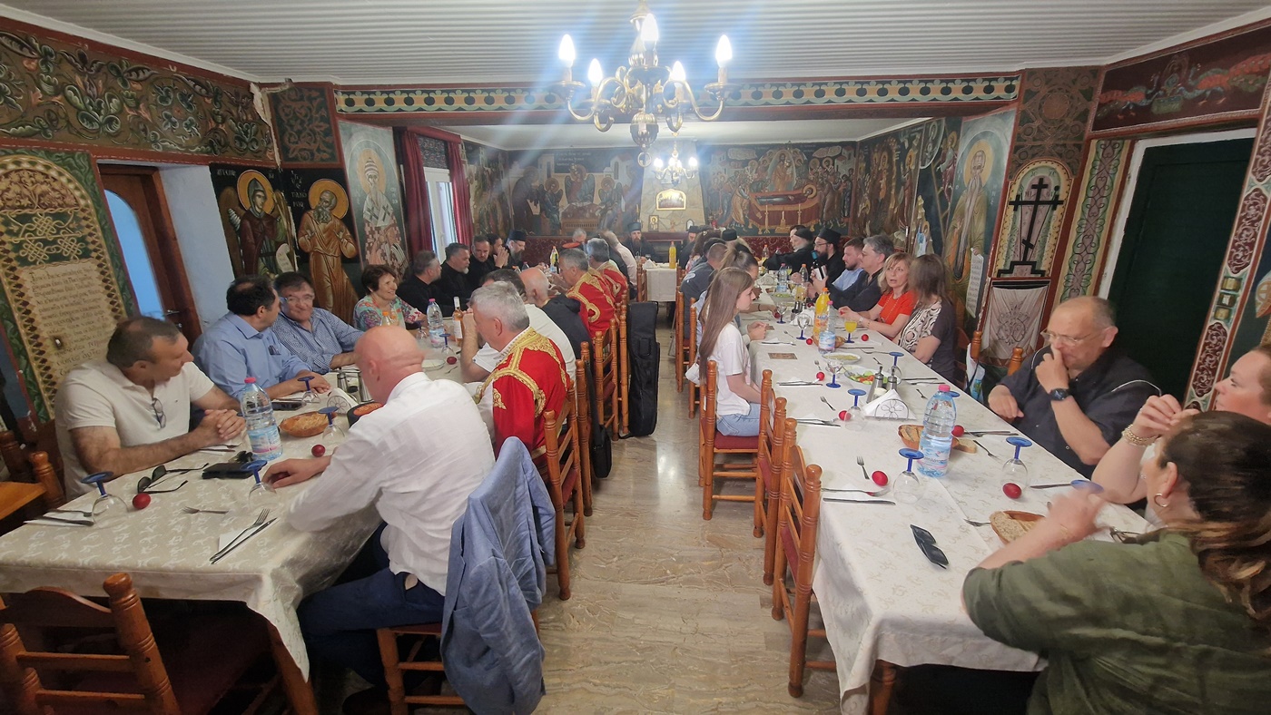 Μετά το μάθημα, οι παρευρισκόμενοι μοιράστηκαν ένα ευλογημένο γεύμα στη Μεγάλη Τράπεζα του μοναστηριού, συνοδευόμενο από κακοτρύγη της οικογένειας Γραμμένου και ροζέ κρασί από τη Μονή Χιλανδαρίου του Αγίου Όρους, ένα οινικό ταξίδι που ένωσε τη Δύση με την Ανατολή και την Κέρκυρα με τη Σερβία.