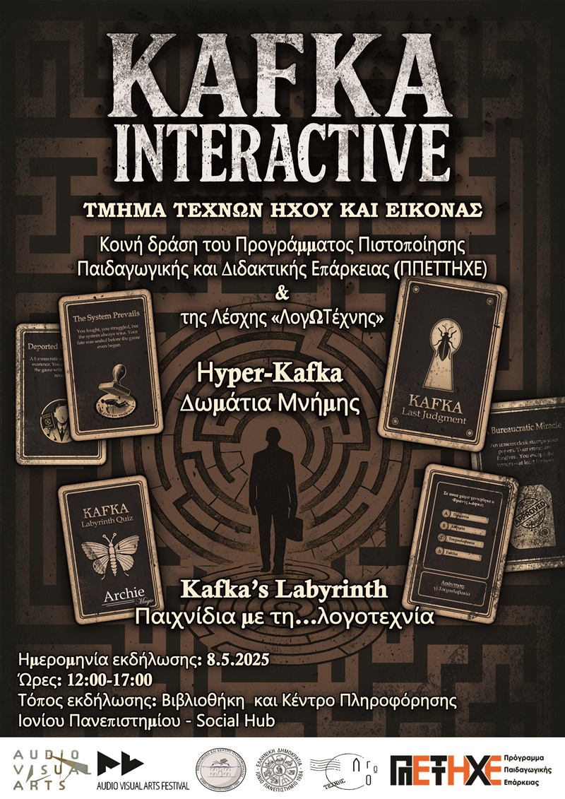 Η δράση «Kafka Interactive» πραγματοποιείται στο πλαίσιο της διοργάνωσης του 18ου Φεστιβάλ Οπτικοακουστικών Τεχνών, του Τμήματος Τεχνών Ήχου και Εικόνας του Ιονίου Πανεπιστημίου και αποτελεί μια διαδραστική εκπαιδευτική καλλιτεχνική δραστηριότητα.