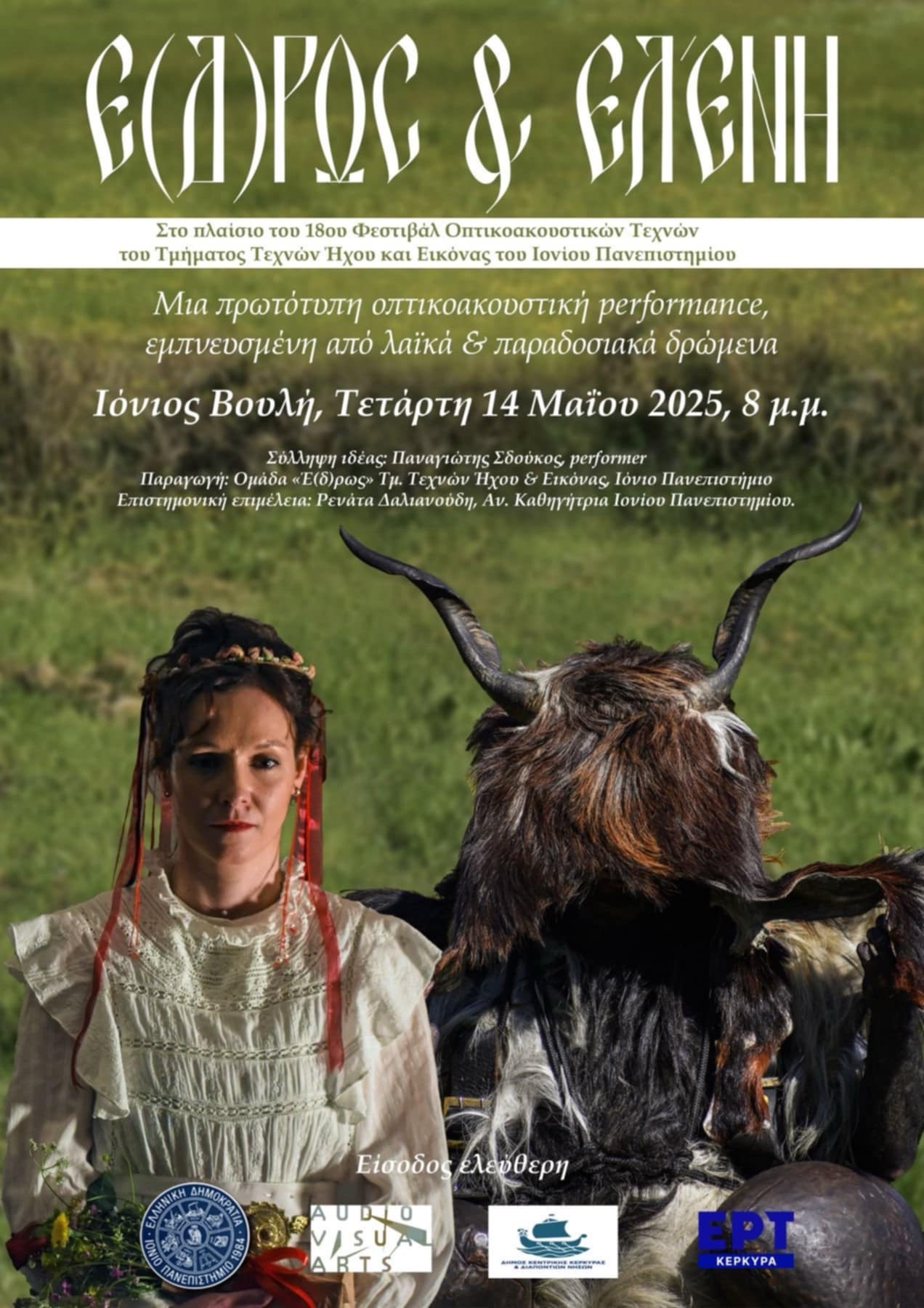 Oπτικοακουστική προβολή, εμπνευσμένη από λαϊκά δρώμενα με τίτλο «Έ(δ)ρως & Ελένη», θα πραγματοποιηθεί σήμερα στις 20.00, στο ιστορικό κτήριο της Ιονίου Βουλής, στο πλαίσιο του 18ου Φεστιβάλ Οπτικοακουστικών Τεχνών του Ιονίου Πανεπιστημίου, προσφέροντας στο κοινό μια ξεχωριστή καλλιτεχνική εμπειρία που συνδυάζει τον ηλεκτροακουστικό ήχο, την τέχνη της κινηματογράφησης και τις παραστατικές τέχνες με το δημοτικό τραγούδι και τα λαϊκά δρώμενα.