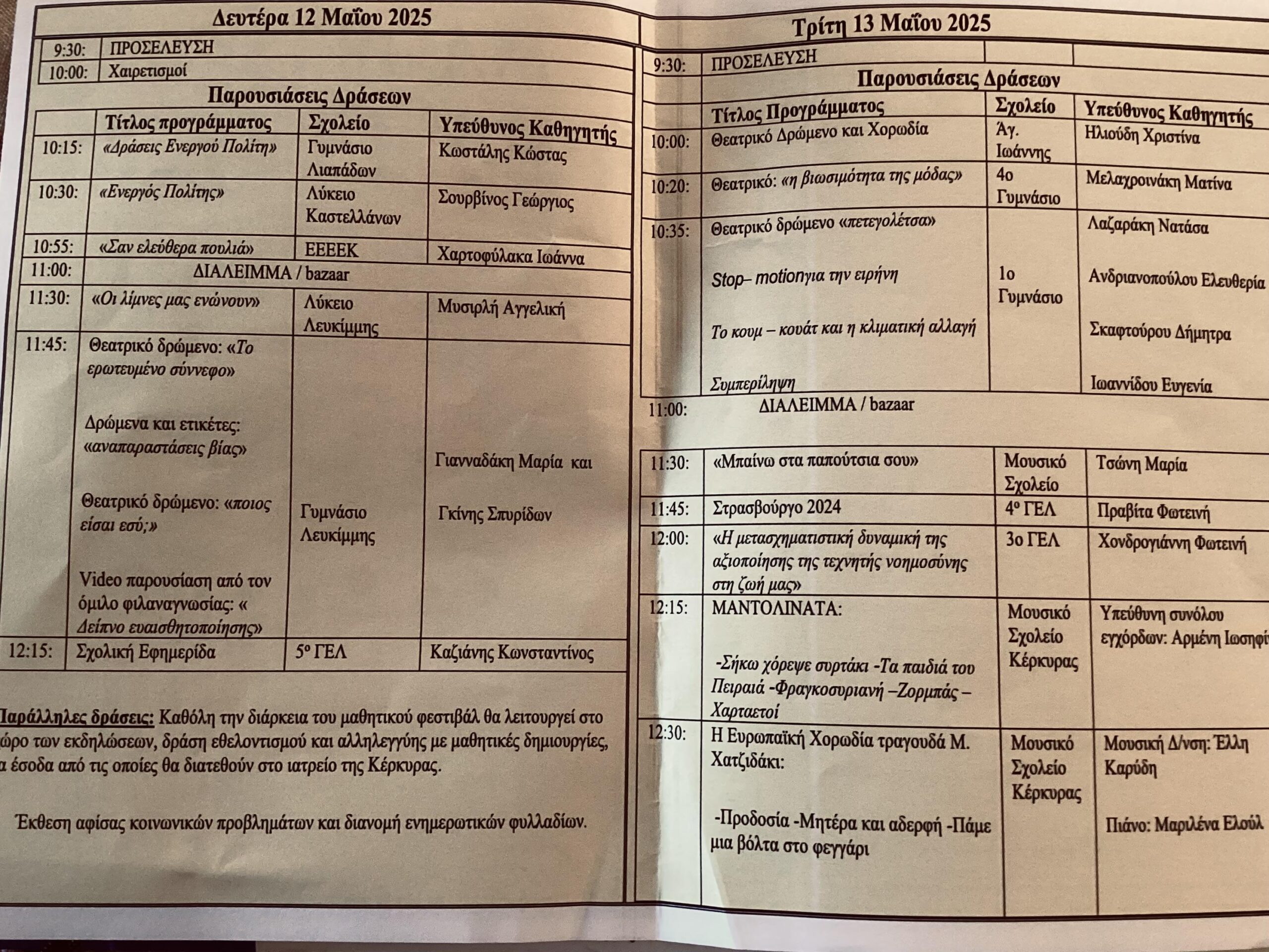 Με απόλυτη επιτυχία ολοκληρώθηκε στις 12 και 13 Μαΐου 2025 το Μαθητικό Φεστιβάλ Ενεργού και Αλληλέγγυου Πολίτη στην αίθουσα πολλαπλών χρήσεων του 4ου Γενικού Λυκείου Κέρκυρας, με τη συμμετοχή σχολικών μονάδων από όλο το νησί.