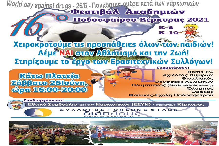 Με αφορμή την παγκόσμια ημέρα κατά των ναρκωτικών το Παράρτημα Κέρκυρας του Εθνικού ΣΥμβουλίου κατά των Ναρκωτικών διοργανώνει εκδηλώσεις ευαισθητοποίησης και ενημέρωσης. Πρόκειται για το φεστιβάλ του ΕΣΥΝ που φέτος συμπληρώνει 20 χρόνια και είναι αφιερωμένο στην ζωή έχοντας κεντρικό σύνθημα «Τα κέρδη τους ή οι ζωές μας. Πες ΝΑΙ στον αθλητισμό και τον πολιτισμό και ΟΧΙ σε όλα τα ναρκωτικά».