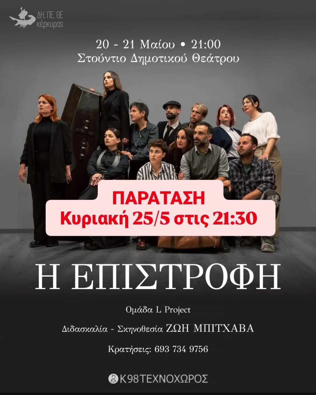 Με μία επιπλέον παράσταση την Κυριακή 25 Μαϊου στις 21.30 στο Studio του ΔΗΠΕΘΕ Κέρκυρας, η ομάδα L.Project του Τεχνοχώρου Κ98 αποχαιρετά την επιτυχημένη τραγική κωμωδία «Η Επιστροφή».