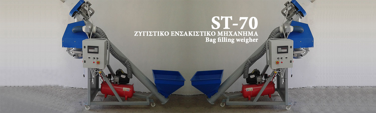 H εταιρεία ΤΟΜΑΣΗΣ Χαράλαμπος & Γεώργιος, ΑΧΑΪΚΗ ΠΛΑΣΤΙΓΓΟΠΟΙΪΑ, κατασκευάζει ζυγιστικά σακιαστικά μηχανήματα. To Μοντέλο ST-70, ένα από τα καλύτερα σακιαστικά, σε ανταγωνιστική τιμή και ποιότητα, είναι πλήρως αυτόματο ηλεκτρονικό, ζυγιστικής ικανότητας 25-60 κιλών δημητριακών καρπών.