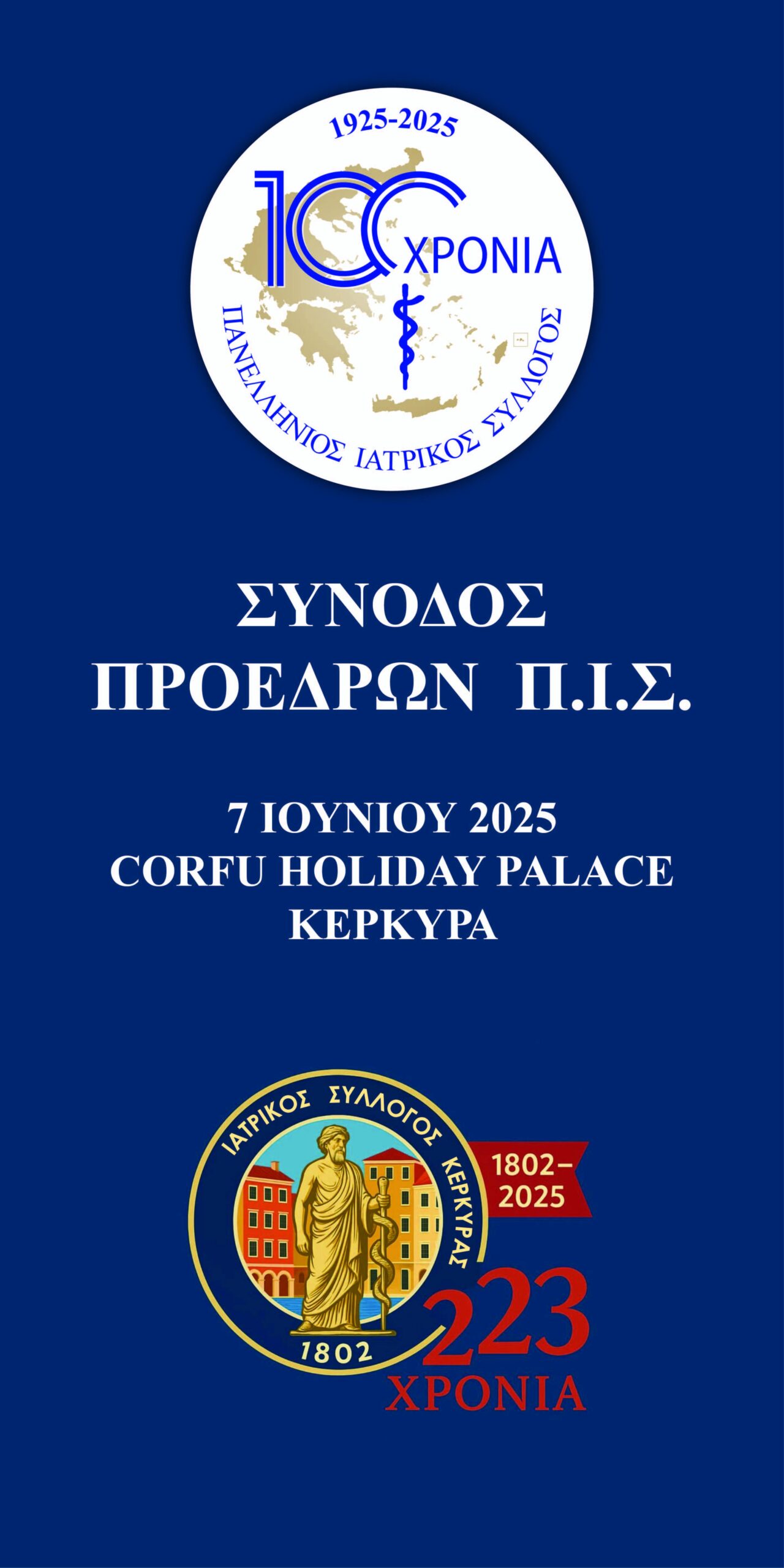 Ο Ιατρικός Σύλλογος Κέρκυρας φιλοξενεί στις 7 και 8 Ιουνίου 2025, στο ξενοδοχείο Corfu Holiday Palace, τη Σύνοδο των Προέδρων των Ιατρικών Συλλόγων της Ελλάδος με το Διοικητικό Συμβούλιο του Πανελληνίου Ιατρικού Συλλόγου. Η Σύνοδος φέρει ιδιαίτερο επετειακό χαρακτήρα, καθώς συμπίπτει με τη συμπλήρωση 100 ετών από την ίδρυση του Πανελληνίου Ιατρικού Συλλόγου και ταυτόχρονα τιμά τη μακρά και ιστορική διαδρομή του Ιατρικού Συλλόγου Κέρκυρας, ο οποίος ιδρύθηκε το 1802 και συμπληρώνει 223 χρόνια συνεχούς παρουσίας και προσφοράς στην ιατρική και την κοινωνία.