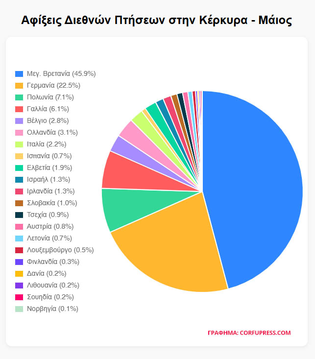 Τον φετινό Μάιο, οι αφίξεις ανά χώρα στο αεροδρόμιο Κέρκυρας ήταν οι εξής: