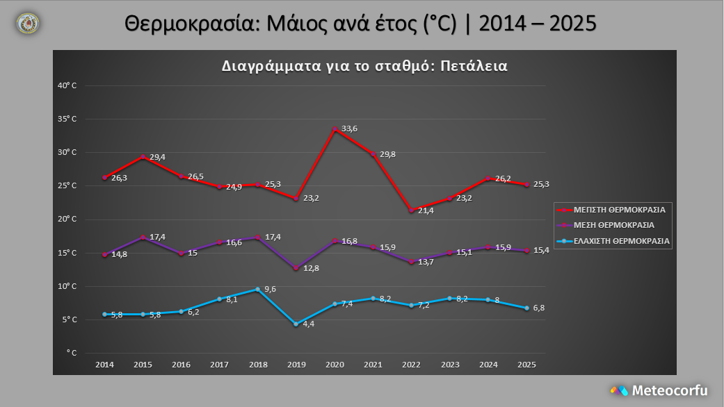 Στατιστικά στοιχεία – Μάιος 2025: Ορεινός ερασιτεχνικός μετεωρολογικός σταθμός Πετάλεια Κέρκυρας (Εθνικό Αστεροσκοπείο Αθηνών).