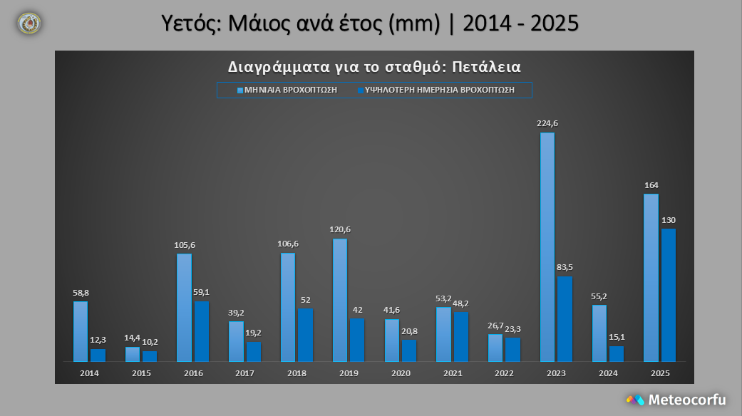 Ο υγρότερος Μάιος ήταν το 2023, με 224.6 mm βροχής. Αντίθετα, το 2022 είχε μόλις 26.7 mm, σημειώνοντας σημαντική υετική έλλειψη.