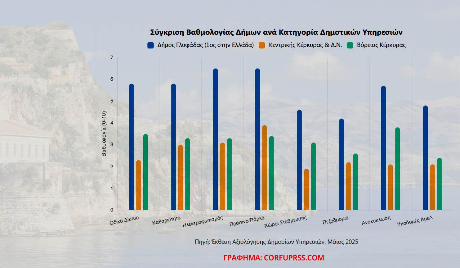 Αξίζει να σημειωθεί πως η απόσταση της Κέρκυρας από τους κορυφαίους δήμους είναι εντυπωσιακή σε κάθε κατηγορία. Γλυφάδα, Άλιμος, Καστοριά, Καλαμάτα, Μετέωρα εμφανίζουν διπλάσιες ή και τριπλάσιες βαθμολογίες, με τους πολίτες εκεί να δηλώνουν ικανοποιημένοι από τις βασικές υπηρεσίες, την καθαριότητα, το πράσινο, τη στάθμευση, τη συντήρηση των δρόμων.