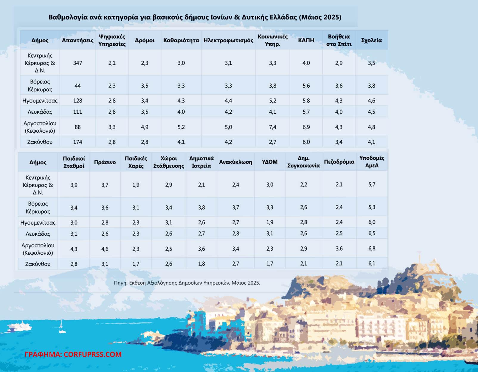 Η πρώτη εθνική αξιολόγηση δημοσίων υπηρεσιών και δήμων φέρνει στο φως μια αλήθεια που οι κάτοικοι της Κέρκυρας γνωρίζουν χρόνια: το νησί βρίσκεται σταθερά στις τελευταίες θέσεις σχεδόν σε κάθε τομέα καθημερινής ζωής, από το οδικό δίκτυο και την καθαριότητα μέχρι τις υποδομές για ΑμεΑ και το πράσινο.
