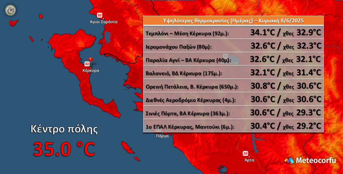 Σε υψηλά επίπεδα διατηρήθηκε η θερμοκρασία στην Κέρκυρα, με τις μέγιστες τιμές να ξεπερνούν τους 37°C. Σύμφωνα με το δίκτυο αυτόματων μετεωρολογικών σταθμών Κέρκυρας & Παξών / Meteocorfu.eu, 8 μετεωρολογικοί σταθμοί κατέγραψαν μέγιστες θερμοκρασίες άνω των 30°C.