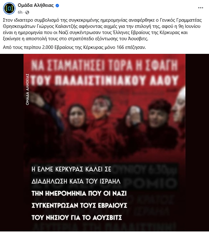 Ο Γενικός Γραμματέας Θρησκευμάτων Γιώργος Καλαντζής κατηγόρησε ανοικτά την ΕΛΜΕ Κέρκυρας επειδή συμμετέχει στη συγκέντρωση κατά της γενοκτονίας των Παλαιστινίων σήμερα, ημέρα επετείου της συγκέντρωσης των Κερκυραίων Εβραίων για να σταλούν στο Άουσβιτς! Από πίσω του το γνωστό προπαγανδιστικό παρακλάδι της Ν.Δ., Ομάδα Αλήθειας, που φρόντισε να διαχυθεί επικοινωνιακά η επίθεση αυτή…