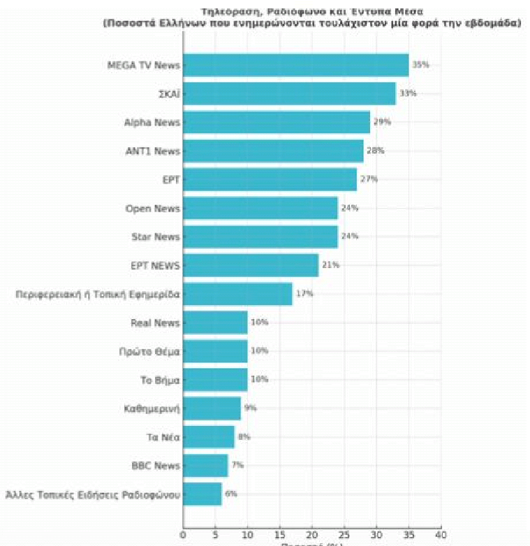 Συγκεκριμένα, για τους Έλληνες που ενηµερώνονται τουλάχιστον µία φορά την εβδοµάδα μέσω των εφημερίδων, οι τοπικές εφημερίδες βρίσκονται στην πρώτη θέση µε ποσοστό 17%, ενώ ακολουθούν η Real News, το Πρώτο Θέµα και το Βήµα µε 10%, , η Καθηµερινή µε 9% και τα Νέα µε 8%.