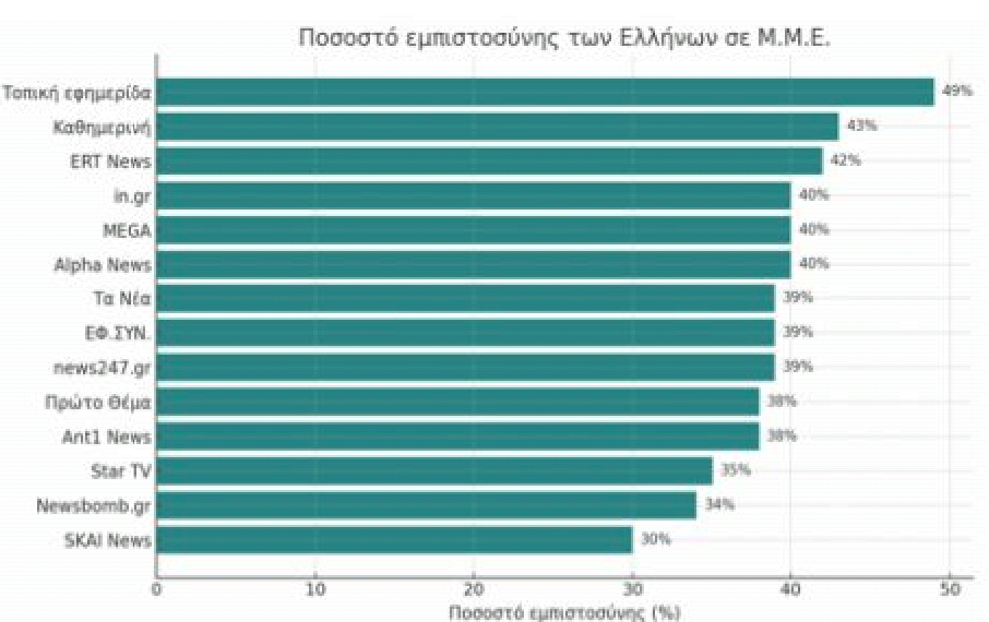 Σύμφωνα λοιπόν, με την ετήσια έρευνα του Ινστιτούτου Reuters, οι τοπικές εφημερίδες βρίσκονται στην ΠΡΩΤΗ θέση στον τοµέα της εµπιστοσύνης των πολιτών απέναντι σε όλες τις κατηγορίες Μ.Μ.Ε. της χώρας, µε ποσοστό εµπιστοσύνης 49%, αφήνοντας στη δεύτερη θέση την εφηµερίδα «Καθηµερινή» µε ποσοστό 43%, ενώ ακολουθούν η ΕΡΤ µε 42%, το in.gr, ο ALPHA και το MEGA µε 40%, τα Νέα, η Εφημερίδα των Συντακτών και το news247.gr με 39%.