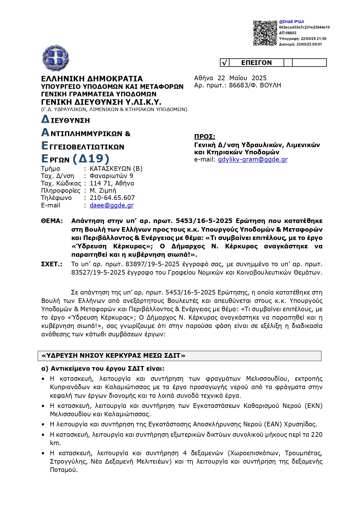 Κατά τα λοιπά, από την απάντηση δεν προκύπτει (και πάλι) ότι εξετάζεται άλλη μέθοδος για την ύδρευση της Κέρκυρας, πέραν της γνωστής των φραγμάτων και των συνοδών έργων. Και βέβαια, ούτε λέξη για το ποιο είναι τελικά το σχέδιο της κυβέρνησης απέναντι στα οξυμμένα προβλήματα υδροδότησης του νησιού.