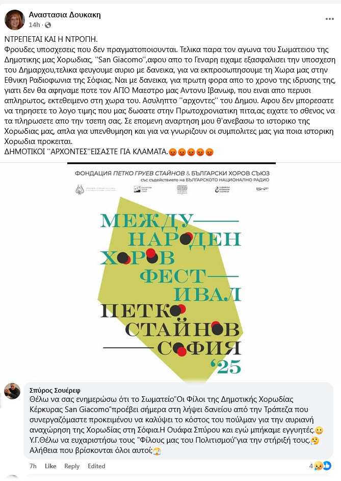 “Ντρέπεται και η ντροπή” γράφει το επί δεκαετίες στέλεχος και χορωδός της Δημοτικής Χορωδίας Κέρκυρας Σαν Τζιάκομο, Αναστασία Δουκάκη, η οποία σε ανάρτησή της στο Facebook καταγγέλλει ότι ο Δήμαρχος Στέφανος Πουλημένος αθέτησε την υπόσχεσή του να πληρώσει για τη μετακίνηση της χορωδίας σε φεστιβάλ της Εθνικής Ραδιοφωνίας Βουλγαρίας, όπου επρόκειτο μάλιστα εκτός των άλλων να τιμηθεί ο σπουδαίος μαέστρος της Άντονι Ιβάνοφ από τους φορείς της χώρας του.