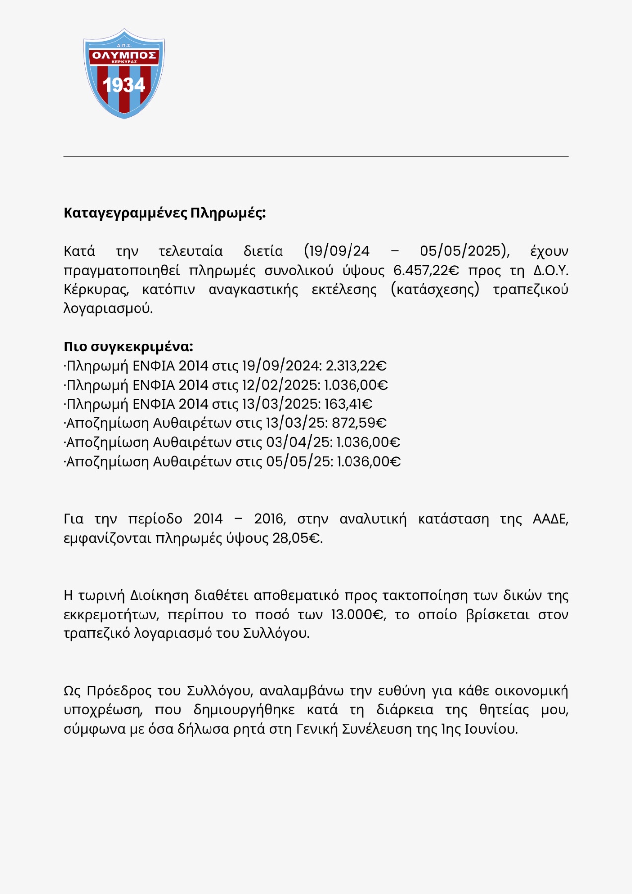 Ο Πρόεδρος του Ολύμπου εξέδωσε ανακοίνωση σε σχέση με την οικονομική κατάσταση και τις συσσωρευμένες οφειλές του σωματείου
