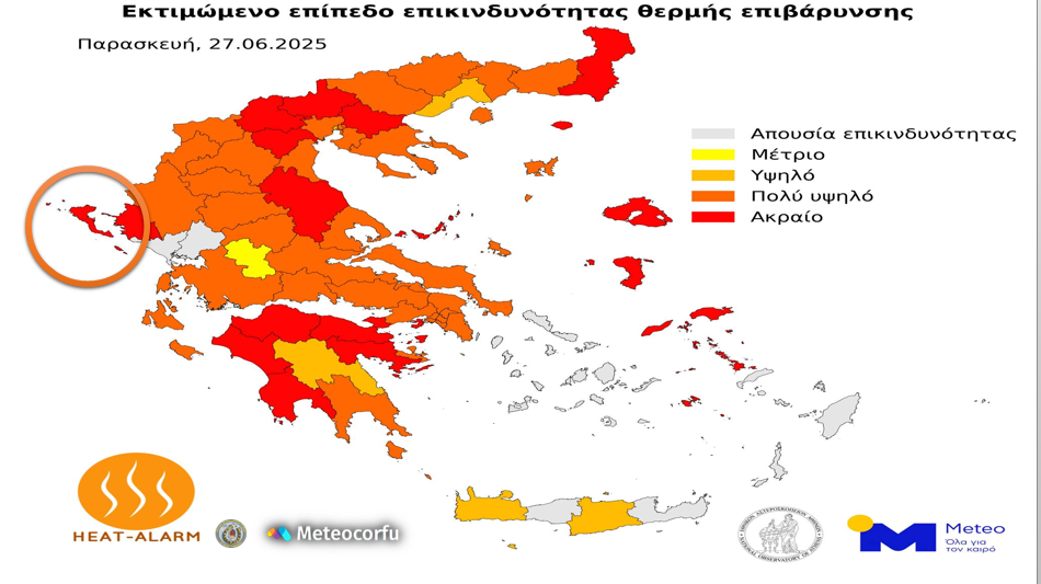 Σύμφωνα με τα τελευταία προγνωστικά δεδομένα του Εθνικού Αστεροσκοπείου Αθηνών / meteo.gr και του συστήματος HEAT-ALARM, η Κέρκυρα αναμένεται να βρεθεί την Παρασκευή 27/06 σε καθεστώς ακραίας θερμικής επιβάρυνσης, όπως αποτυπώνεται στον σχετικό χάρτη εκτίμησης επικινδυνότητας.