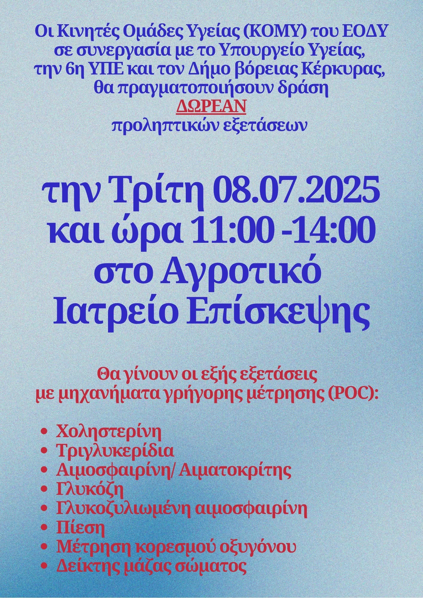 ΚΟΙΝΩΝΙΑΕΛΕΥΘΕΡΟΕΙΔΗΣΕΙΣ Δωρεάν προληπτικές εξετάσεις στην Επίσκεψη Οι εξετάσεις θα πραγματοποιηθούν την Τρίτη στο αγροτικό ιατρείο της Επίσκεψης. Last updated: 04/07/2025 07:45 CorfuPress.com Published: 04/07/2025 Share SHARE Οι εξετάσεις θα πραγματοποιηθούν την Τρίτη στο αγροτικό ιατρείο της Επίσκεψης. Επίσκεψη: Ο «Χορός των Παπάδων» αναβίωσε την Κυριακή της Τυροφάγου Δήμος Βορρά: Προληπτικές ιατρικές εξετάσεις 8-10 Νοεμβρίου Κάλαντα του Λαζάρου στην Επίσκεψη: Η ιστορία τους από τον Στ. Δένδια Tα κάλαντα του Λαζάρου στην Επίσκεψη (2023) Tα κάλαντα του Λαζάρου στην Επίσκεψη (video, pics) Share This Article Facebook Whatsapp Whatsapp Email Copy Link Print Previous Article Την Παρασκευή 4 Ιουλίου γιορτάζει… Next Article Άριστα Παμψηφεί και Α΄ Βραβείο του Ωδείου στον πιανίστα Μπράχμα Τζωρτζ Σαβαδράμ Δεν υπάρχουν Σχόλια Δεν υπάρχουν Σχόλια Αφήστε μια απάντηση Ακύρωση απάντησηςΗ ηλ. διεύθυνση σας δεν δημοσιεύεται. Τα υποχρεωτικά πεδία σημειώνονται με *Σχόλιο * Όνομα * Email * Ιστότοπος Αποθήκευσε το όνομά μου, email, και τον ιστότοπο μου σε αυτόν τον πλοηγό για την επόμενη φορά που θα σχολιάσω. ΑναζήτησηΑναζήτησηRecent PostsΌλα τα μάτια στον Θοδωρή, τον καπετάνιο μας! Τη Δευτέρα 22 Σεπτεμβρίου γιορτάζει… Σαν Σήμερα 22/9: Τα σημαντικότερα γεγονότα… Η πρόγνωση του καιρού Έφηβοι Ιονίου: Με περίπατο, συνεχίζουν στο Rising Stars! Recent CommentsΧωρίς σχόλια για εμφάνιση.