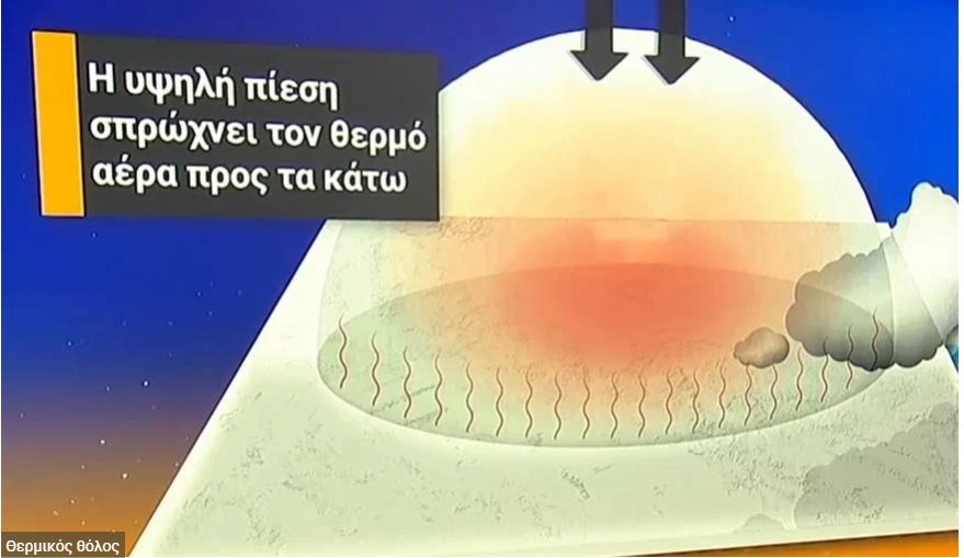 Τι είναι ο θερμικός θόλος; Πρόκειται για μια εκτεταμένη περιοχή υψηλής ατμοσφαιρικής πίεσης που παγιδεύει θερμό αέρα κοντά στην επιφάνεια της Γης. Ο αέρας δεν μπορεί να διαφύγει προς τα πάνω, με αποτέλεσμα η θερμότητα να συσσωρεύεται μέρα με τη μέρα, οδηγώντας σε ακραίες θερμοκρασίες.