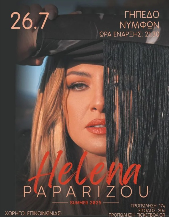 Ο Πολιτιστικός Σύλλογος Νυμφών ανακοινώνει με χαρά πως η Έλενα Παπαρίζου θα εμφανιστεί ζωντανά στο Γήπεδο Νυμφών το Σάββατο 26 Ιουλίου 2025.