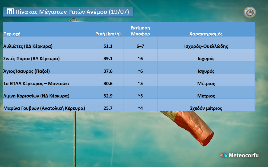 Από το πρωί του Σαββάτου 19/07, πνέουν βορειοδυτικοί άνεμοι στα Διαπόντια Νησιά και στα δυτικά παραθαλάσσια τμήματα της Κέρκυρας – ο γνωστός μας Μαΐστρος κάνει αισθητή την παρουσία του.