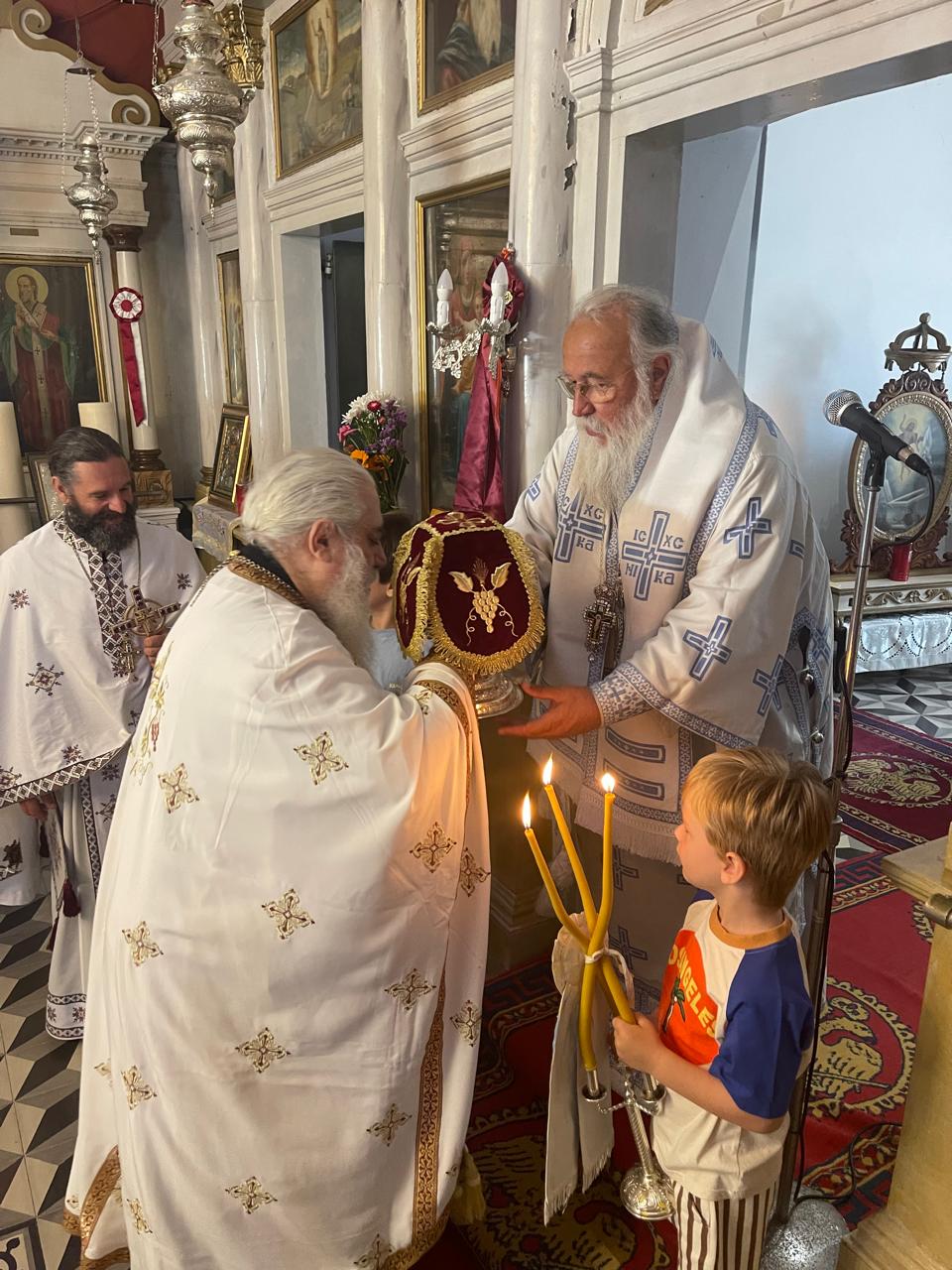 Στο τέλος, ο Σεβασμιώτατος ευχήθηκε σε όλους τους εκκλησιαζομένους, ντόπιους και παλιννοστούντας, να είμαστε ριζωμένοι στην Εκκλησία και στην αγάπη της πατρίδος μας και στην αγάπη Εκείνου και τότε, τα φαινόμενα κάθε εποχής και τα γεγονότα κάθε εποχής μόνον Εκείνη μπορεί να τα ερμηνεύσει και εμείς να αναθέτουμε δια της πίστεώς μας την ελπίδα μας στα χέρια του Θεού. Επίσης, ευχήθηκε να έχουν όλοι καλό υπόλοιπο καλοκαιριού, να έχουν καλή διαμονή και να επιστρέψουν ανεφοδιασμένοι πνευματικά και ψυχικά στην ξενιτειά.
