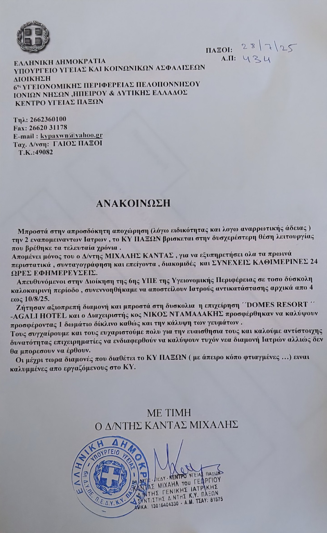 Σύμφωνα με τον Δ/ντη, το Κέντρο Υγείας Παξών βρίσκεται στη δυσχερέστερη θέση που βρέθηκε τα τελευταία χρόνια.