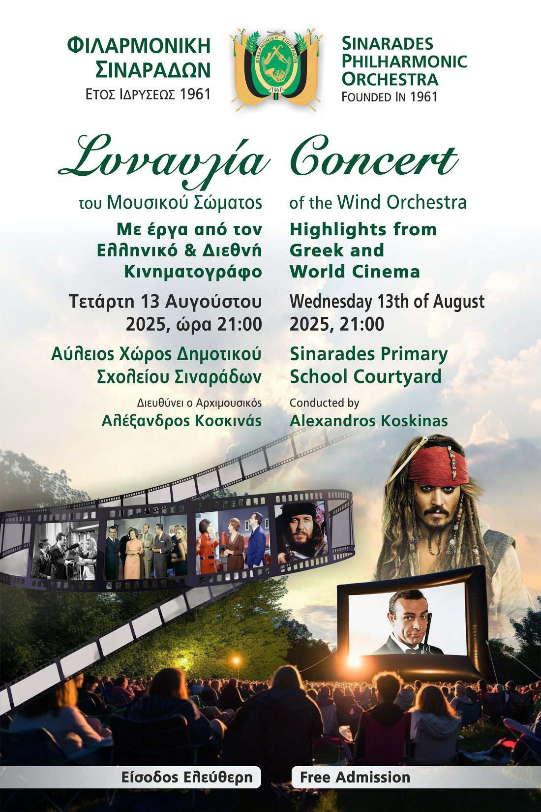 Η Φιλαρμονική Σιναράδων ανακοινώνει τη διοργάνωση της ετήσιας καλοκαιρινής συναυλίας του Μουσικού της Σώματος, η οποία θα πραγματοποιηθεί την Τετάρτη 13 Αυγούστου 2025 και ώρα 21:00, στον αύλειο χώρο του Δημοτικού Σχολείου Σιναράδων.