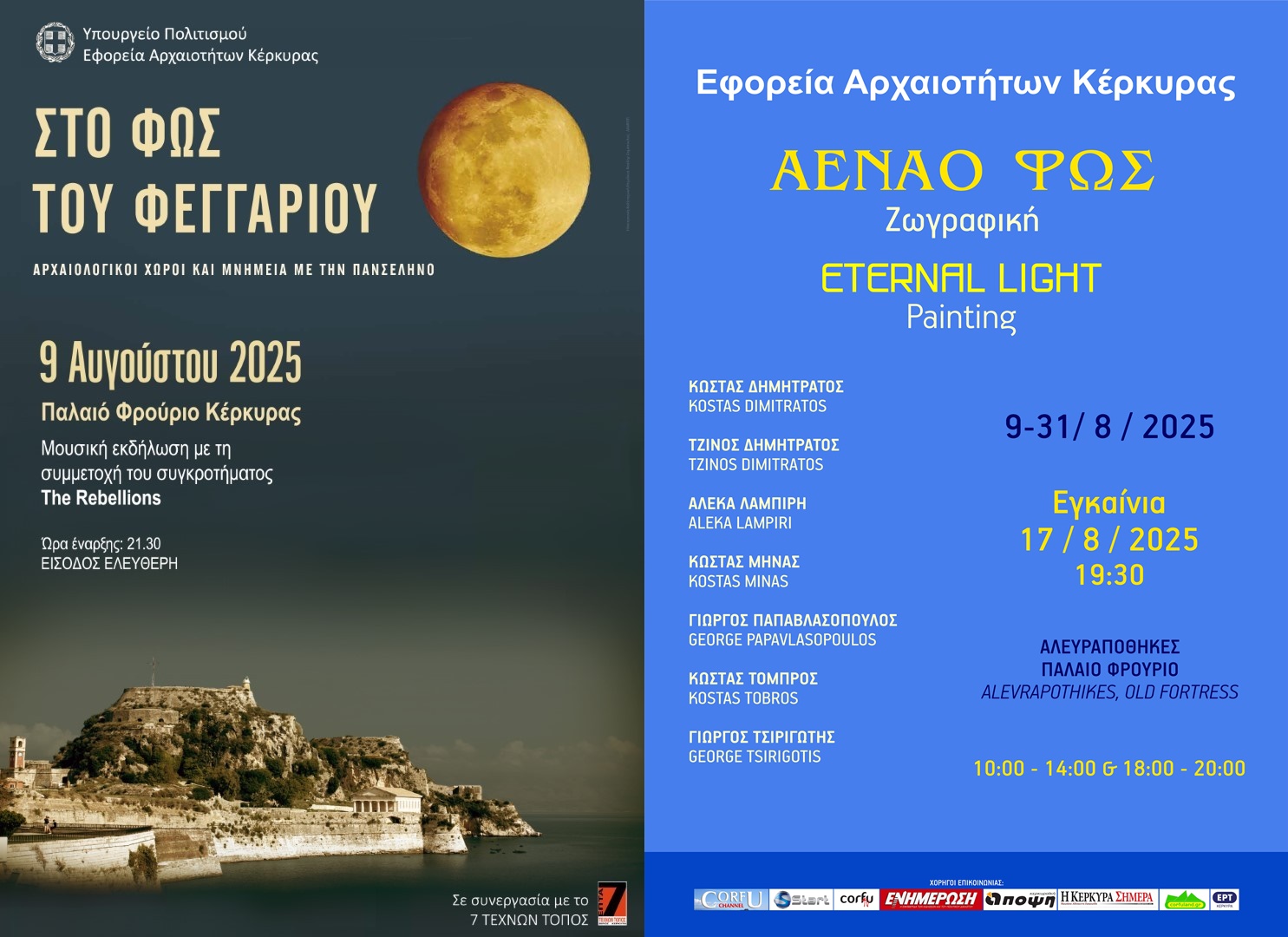 Η Εφορεία Αρχαιοτήτων Κέρκυρας, στο πλαίσιο του εορτασμού της Αυγουστιάτικης Πανσελήνου, διοργανώνει σε συνεργασία με τον φορέα ΕΠΤΑ ΤΕΧΝΩΝ ΤΟΠΟΣ μουσική εκδήλωση με το συγκρότημα ΤΗΕ REBELLIONS το Σάββατο 9 Αυγούστου 2025 στις 9:30 μ.μ., στο Παλαιό Φρούριο.