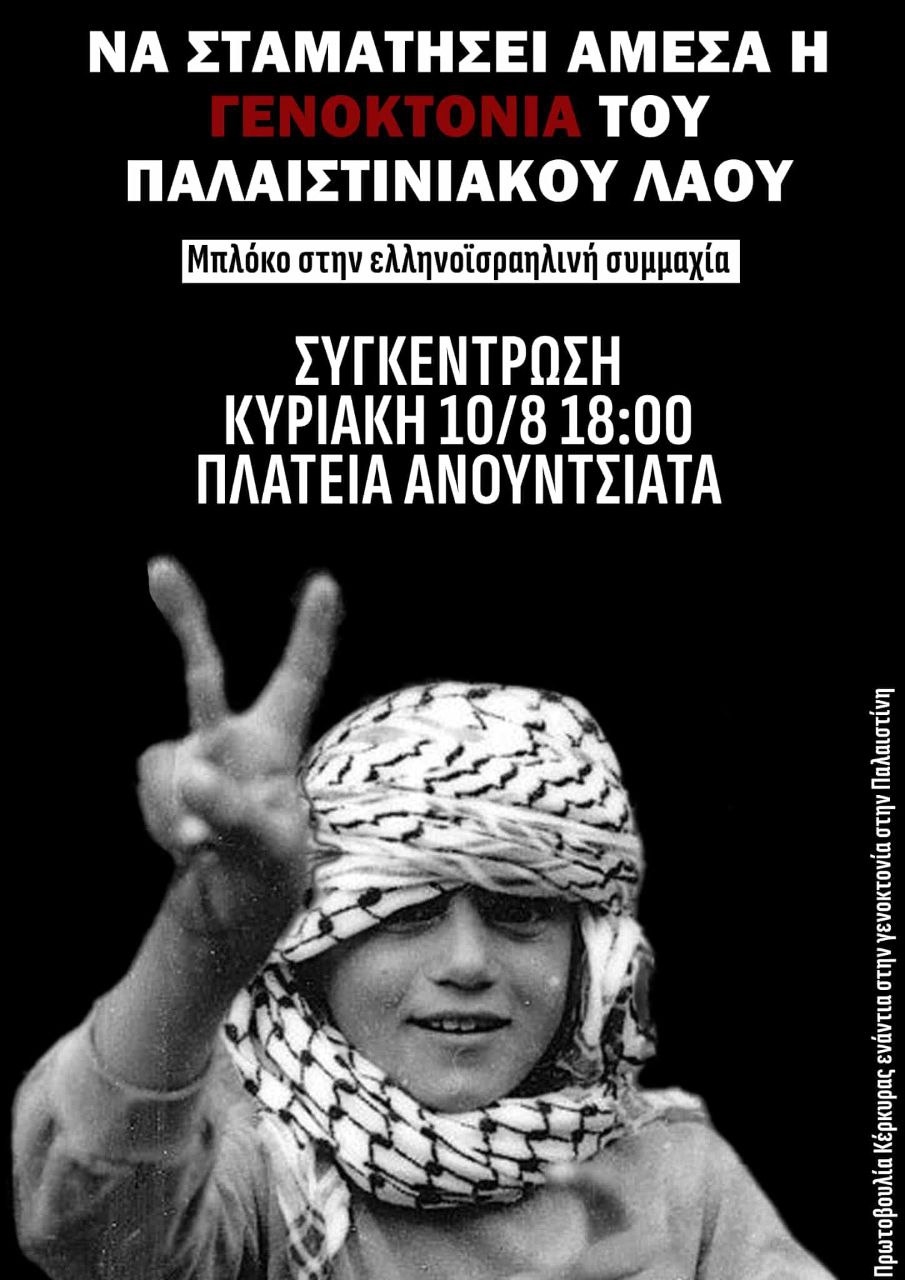 Η “Πρωτοβουλία Κέρκυρας ενάντια στην γενοκτονία στη Παλαιστίνη“ διοργανωνει την Κυριακή στις 18:00 στην πλατεία της Ανουτσιάτα συγκέντρωση διαμαρτυρίας & πορεία ενάντια στη γενοκτονία και λιμοκτονία του Παλαιστινιακού λαού.