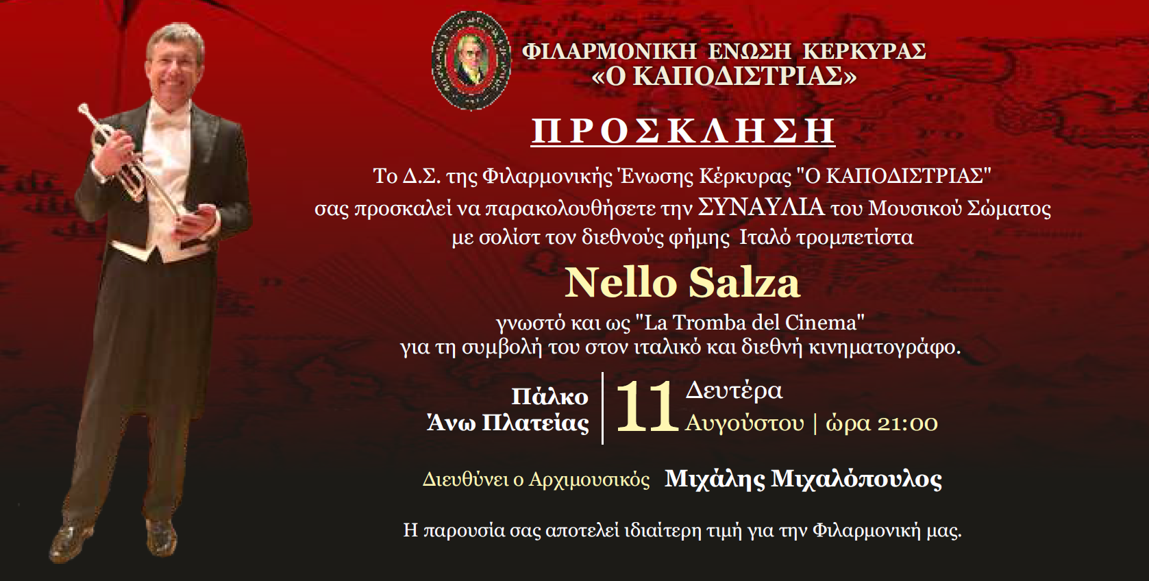 Η εκδήλωση θα ξεκινήσει στις 9 το βράδυ. Σολίστ θα είναι ο διεθνούς φήμης τρομπετίστας Nello Salza. Δ/νση Μιχάλης Μιχαλόπουλος.