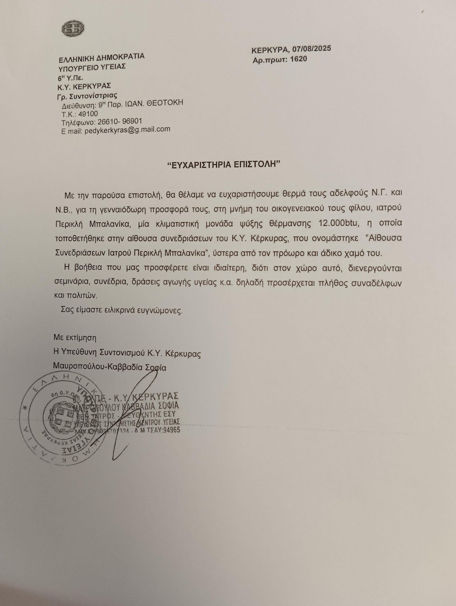 ΚΟΙΝΩΝΙΑΕΛΕΥΘΕΡΟΕΙΔΗΣΕΙΣ Ευχαριστήρια επιστολή του ΚΥ Κέρκυρας για τη προσφορά κλιματιστικού Η προσφορά έγινε από δύο αδέρφια, στη μνήμη του οικογενειακού τους φίλου, ιατρού Περικλή Μπαλανίκα. Last updated: 06/10/2025 18:58 CorfuPress.com Published: 12/08/2025 Share SHARE Η προσφορά έγινε από δύο αδέρφια, στη μνήμη του οικογενειακού τους φίλου, ιατρού Περικλή Μπαλανίκα. Ο Ροταριανός Όμιλος προσέφερε δύο κλιματιστικά στο Κέντρο Υγείας Κέρκυρας Κέντρο Υγείας: Αίθουσα συνεδριάσεων “Περικλής Μπαλανίκας” Δράση του ΚΥ Κέρκυρας με αφορμή τον μήνα ευαισθητοποίησης για τον καρκίνο του μαστού Κέντρο Υγείας Κέρκυρας: Από Δευτέρα, η συνταγογράφηση για τα αντιγριπικά Ο Καρβέλης παρουσιάζει το νέο υπερηχοτομογράφο πολλαπλών χρήσεων στο ΚΥ Κέρκυρας Share This Article Facebook Whatsapp Whatsapp Email Copy Link Print Previous Article Τι ζητά το Επιμελητήριο από την Fraport για τις ημέρες που θα κλείσει το Ι. Καποδίστριας Next Article Δυο διακομιδές από την Κέρκυρα, μια από τους Οθωνούς Δεν υπάρχουν Σχόλια Δεν υπάρχουν Σχόλια Αφήστε μια απάντηση Ακύρωση απάντησηςΗ ηλ. διεύθυνση σας δεν δημοσιεύεται. Τα υποχρεωτικά πεδία σημειώνονται με *Σχόλιο * Όνομα * Email * Ιστότοπος Αποθήκευσε το όνομά μου, email, και τον ιστότοπο μου σε αυτόν τον πλοηγό για την επόμενη φορά που θα σχολιάσω. ΑναζήτησηΑναζήτησηRecent PostsΌλα τα μάτια στον Θοδωρή, τον καπετάνιο μας! Τη Δευτέρα 22 Σεπτεμβρίου γιορτάζει… Σαν Σήμερα 22/9: Τα σημαντικότερα γεγονότα… Η πρόγνωση του καιρού Έφηβοι Ιονίου: Με περίπατο, συνεχίζουν στο Rising Stars! Recent CommentsΧωρίς σχόλια για εμφάνιση.