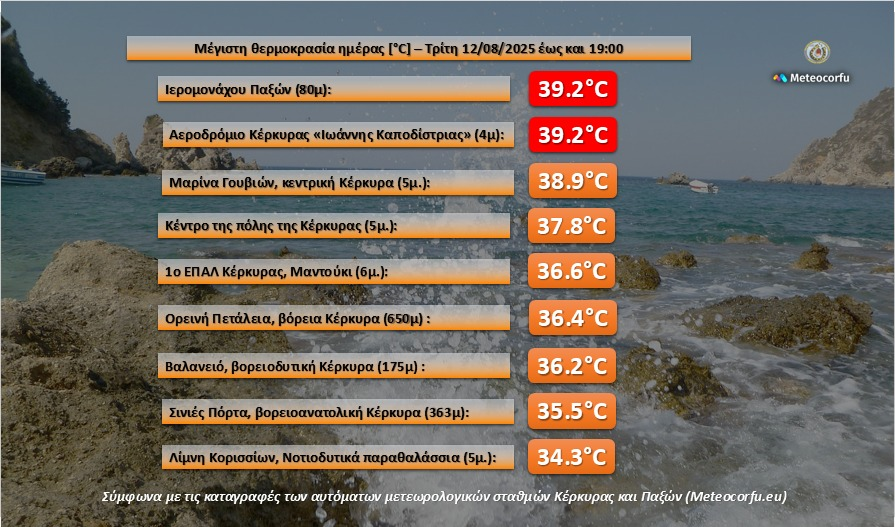 Οι υψηλότερες τιμές εντοπίζονται σε χαμηλά υψόμετρα και παραθαλάσσιες περιοχές, με κορυφή στους Παξούς και το Αεροδρόμιο Κέρκυρας, σύμφωνα με το δίκτυο αυτόματων μετεωρολογικών σταθμών Κέρκυρας και Παξων / meteocorfu.