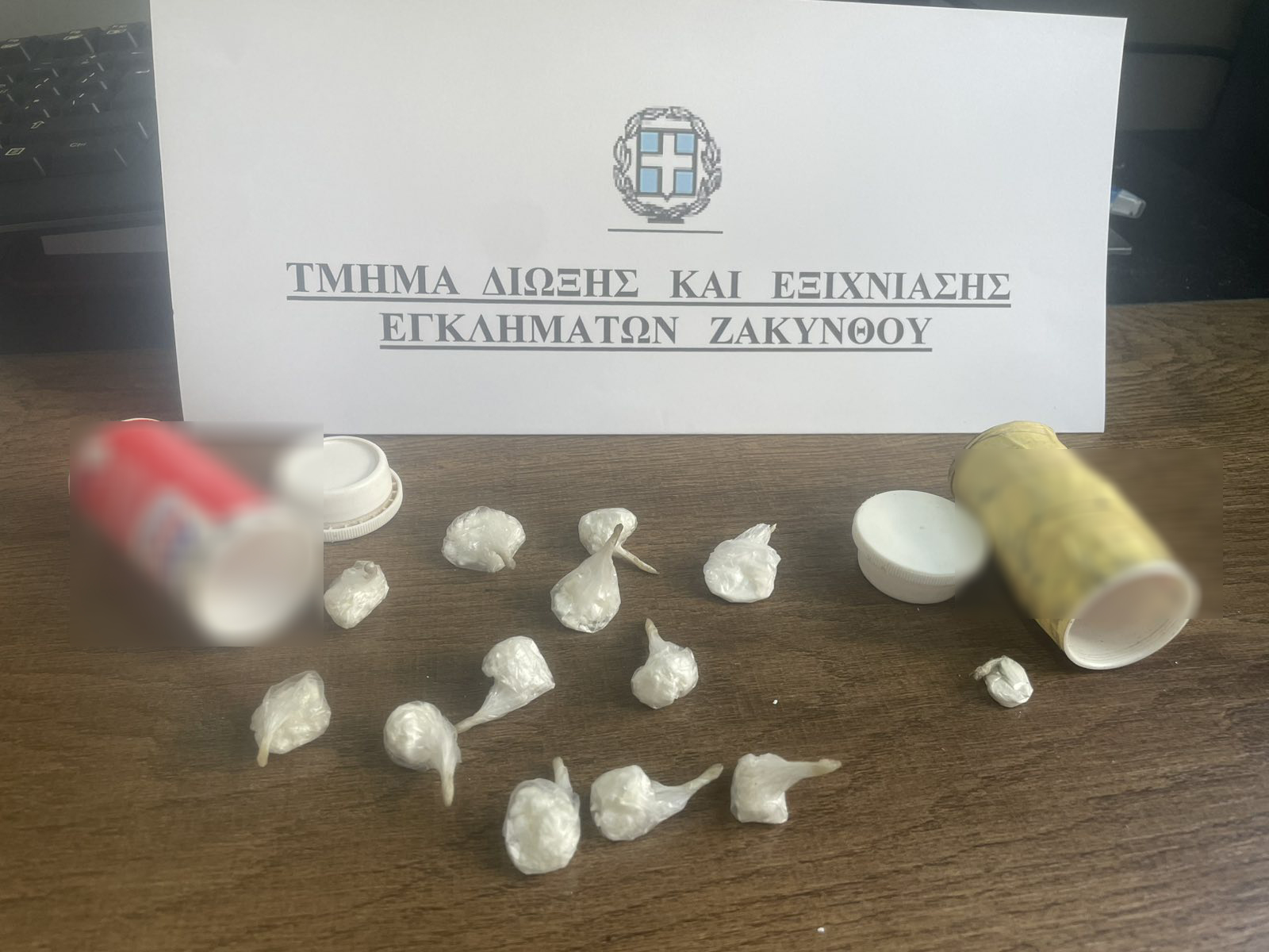 Στο πλαίσιο συντονισμένης αστυνομικής επιχείρησης, οι δράστες εντοπίστηκαν στην παραπάνω υπαίθρια περιοχή και στην κατοχή τους βρέθηκαν -11- «φιξάκια» με κοκαΐνη, τα οποία είχαν κρυμμένα σε ρίζα ελιάς.