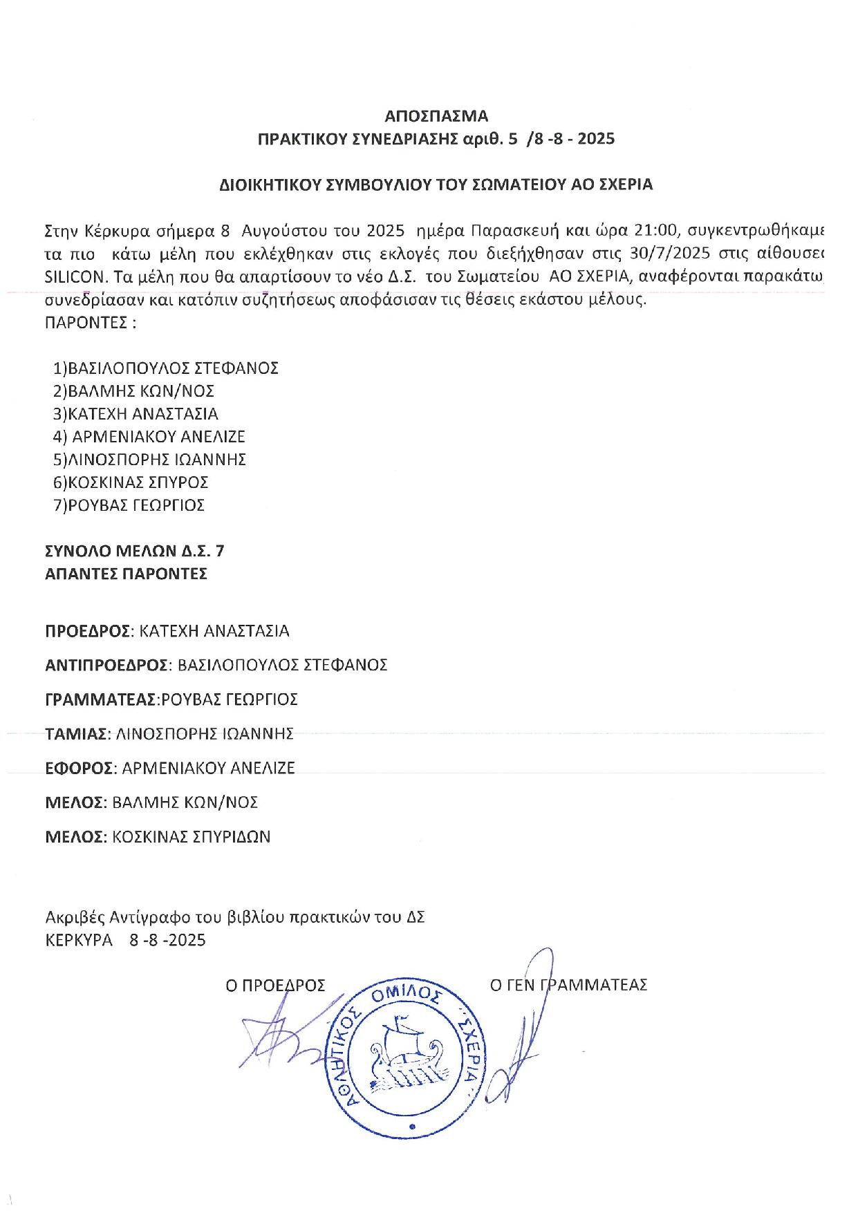 H Αναστασία Κατέχη εξελέγη πρόεδρος του ΑΟ Σχερία μετά τις εκλογές που πραγματοποιήθηκαν και εν συνεχεία τη συγκρότηση του νέου ΔΣ σε σώμα.