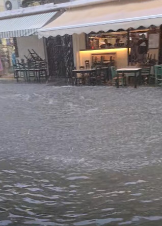 Η βροχή αρχικά συνοδεύτηκε από ισχυρούς άνεμους, ενώ βρήκε απροετοίμαστους πολλούς τουρίστες οι οποίοι είτε με αδιάβροχα μίας χρήσης, είτε με σακούλες προσπαθούσαν να προφυλαχτούν και να βρουν έστω ένα υπόστεγο.