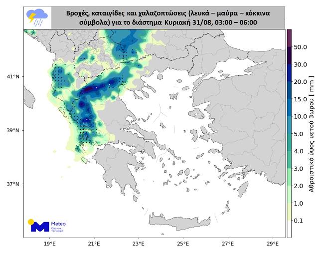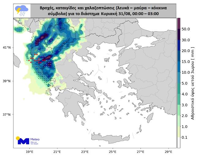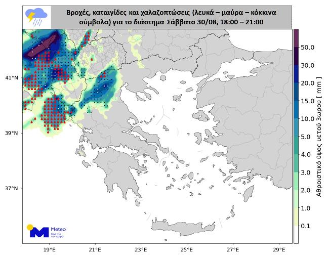 Στους προγνωστικούς χάρτες που ακολουθούν για τα διαστήματα Σάββατο 30/08, 18:00 – 21:00 , Κυριακή 31/08, 00:00 – 03:00 και Κυριακή 31/08, 03:00 – 06:00 αποτυπώνονται οι περιοχές όπου θα εκδηλωθούν βροχές ή καταιγίδες και οι περιοχές όπου εντοπίζεται η μεγαλύτερη πιθανότητα εκδήλωσης χαλαζοπτώσεων. Οι μαύρες κουκκίδες απεικονίζουν χαλάζι με μεγέθη έως 2 εκατοστά, τα κόκκινα τρίγωνα απεικονίζουν χαλάζι με μεγέθη μεγαλύτερα των 2 εκατοστών, ενώ οι λευκές κουκκίδες δείχνουν πού αναμένονται μεγάλες ποσότητες χαλαζιού