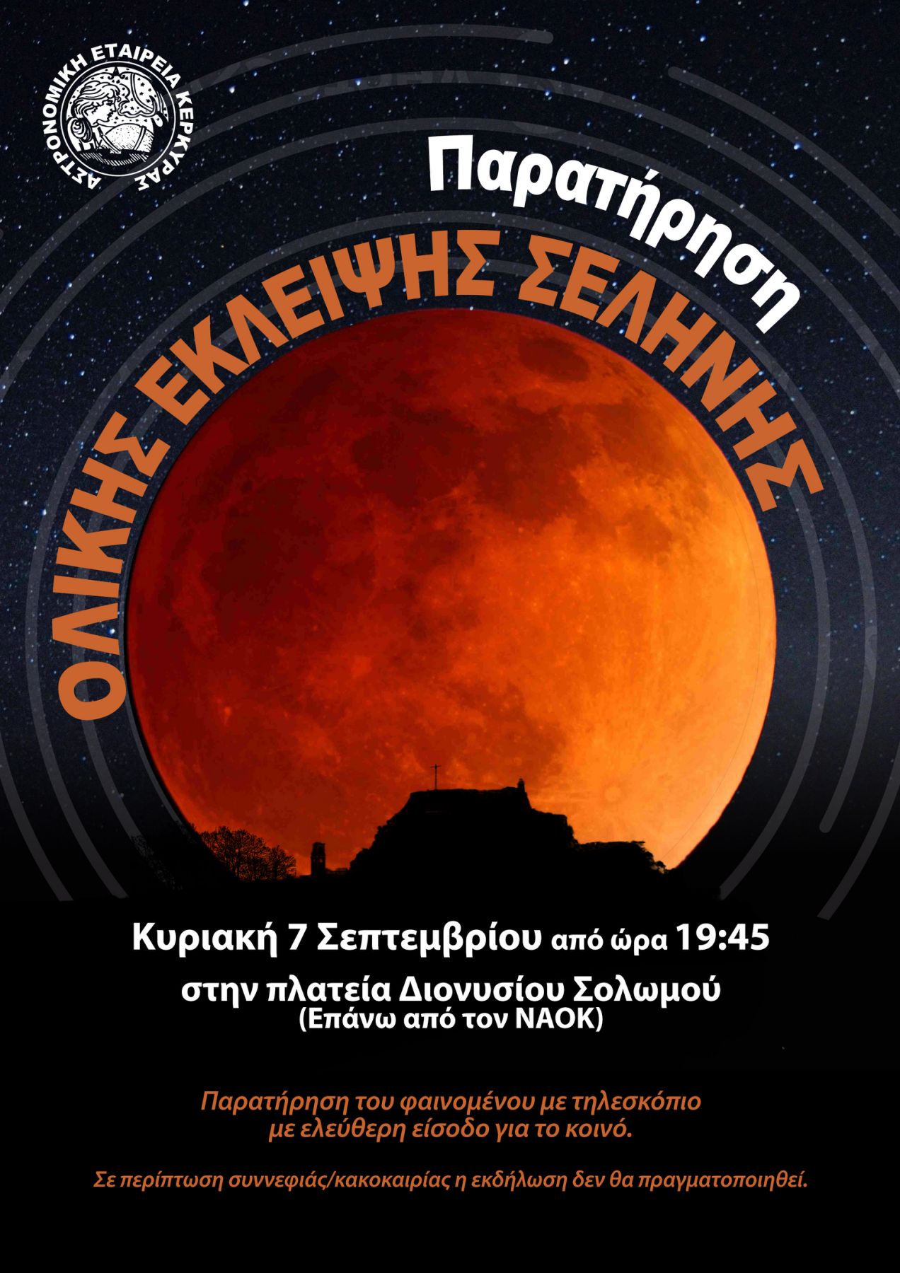 Η Αστρονομική Εταιρεία Κέρκυρας, ενημερώνει για το φαινόμενο της Ολικής Έκλειψης της Σελήνης, την Κυριακή 7 Σεπτεμβρίου 2025, η οποία θα είναι ορατή και από την Κέρκυρα.