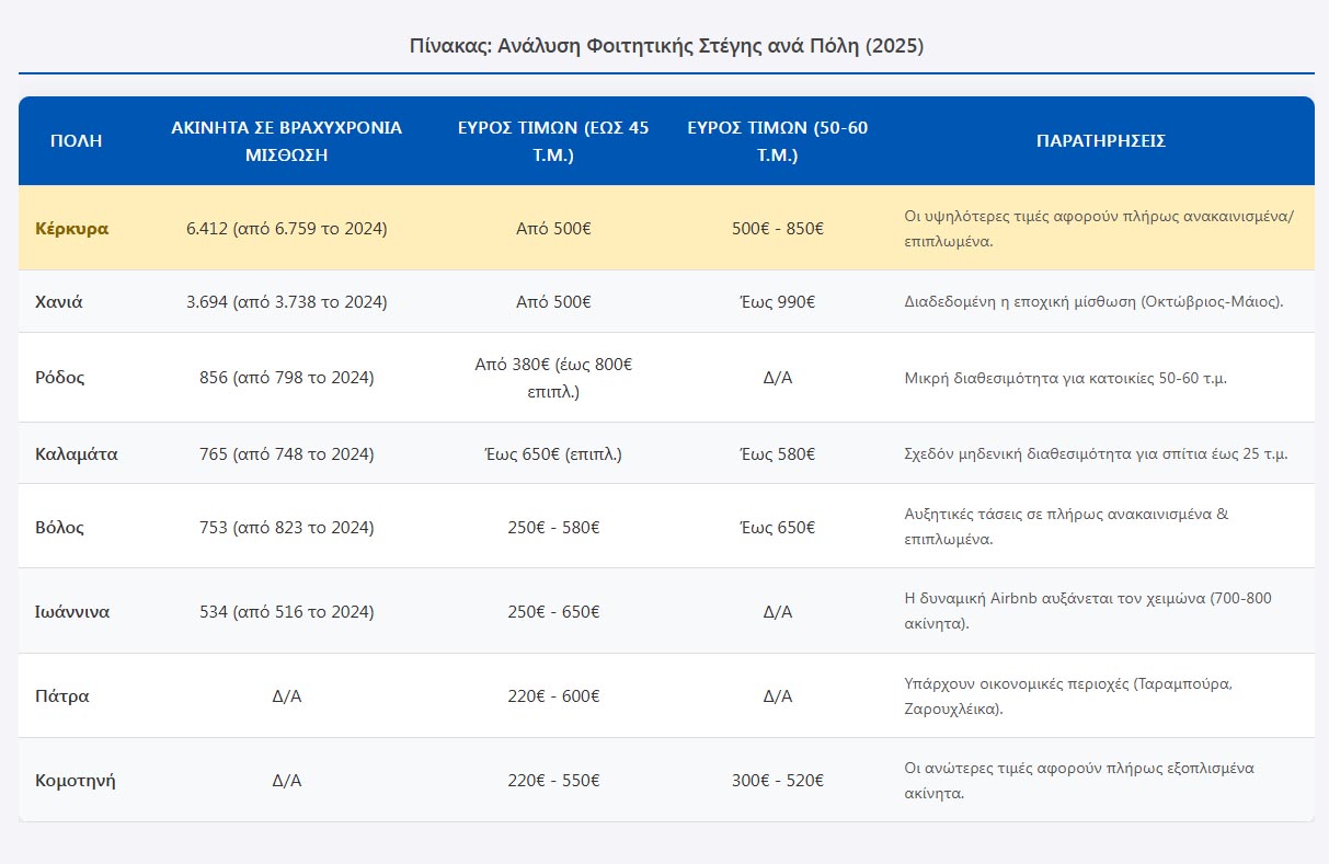 Η εικόνα γίνεται πιο ευκρινής όταν η Κέρκυρα αντιπαραβάλλεται με τα μεγάλα αστικά κέντρα και τις ηπειρωτικές φοιτητουπόλεις. Σε όρους κόστους ανά τετραγωνικό μέτρο, ένα διαμέρισμα 25 τ.μ. στην Κέρκυρα με ενοίκιο 500€ φτάνει τα 20€/τ.μ., τιμή που ανταγωνίζεται ή και ξεπερνά τις τιμές σε περιζήτητες περιοχές του κέντρου της Αθήνας (π.χ. Κυνοσάργους, Πολύγωνο) και της Θεσσαλονίκης (π.χ. Αγία Σοφία, Κέντρο Νεάπολης).