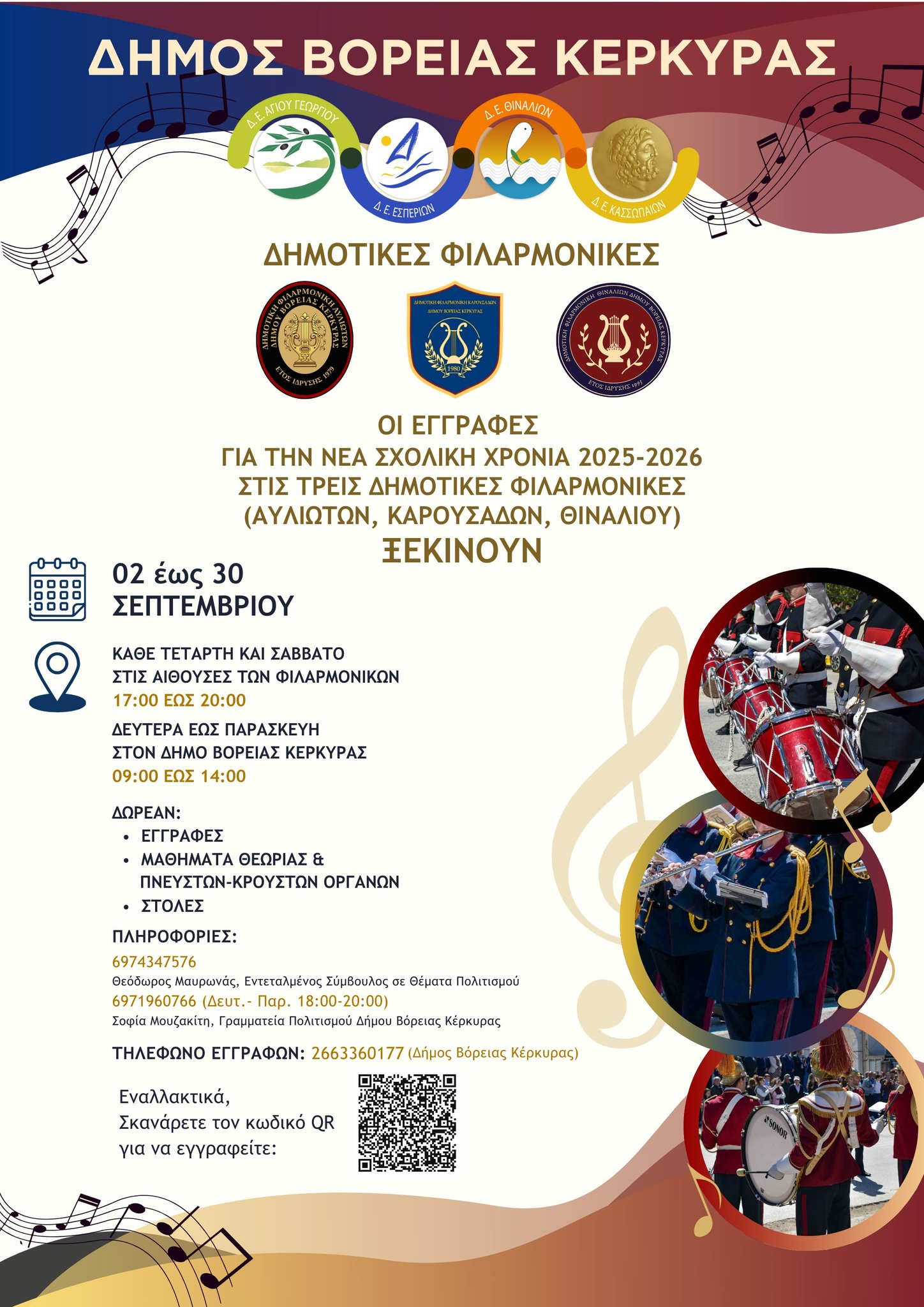 Οι Δημοτικές Φιλαρμονικές του Δήμου Βόρειας Κέρκυρας (Αυλιωτών, Καρουσάδων, Θιναλίων) ανοίγουν και φέτος τις πόρτες τους σε όλα τα παιδιά και τους ενήλικες που θέλουν να γνωρίσουν τον μαγικό κόσμο της μουσικής!